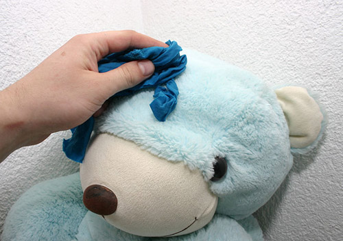 Bạn dùng miếng bông gòn hoặc khăn mềm, thấm nước và cho một lượng dầu gội đầu trẻ em vào. Rồi chà xát lên thú nhồi bông, các khe nhỏ như mắt, mũi. Chà xát cho đến khi nào lớp bụi bám trên thú bông được tẩy sạch thì thôi. Sau đó, bạn chỉ cần dùng miếng vải ngấm nước sạch lau lại lần nữa cho hết bọt dầu gội và đem ra phơi nắng cho khô.